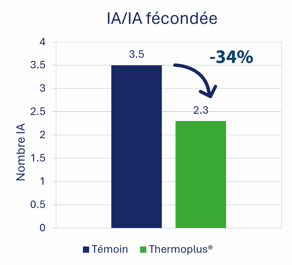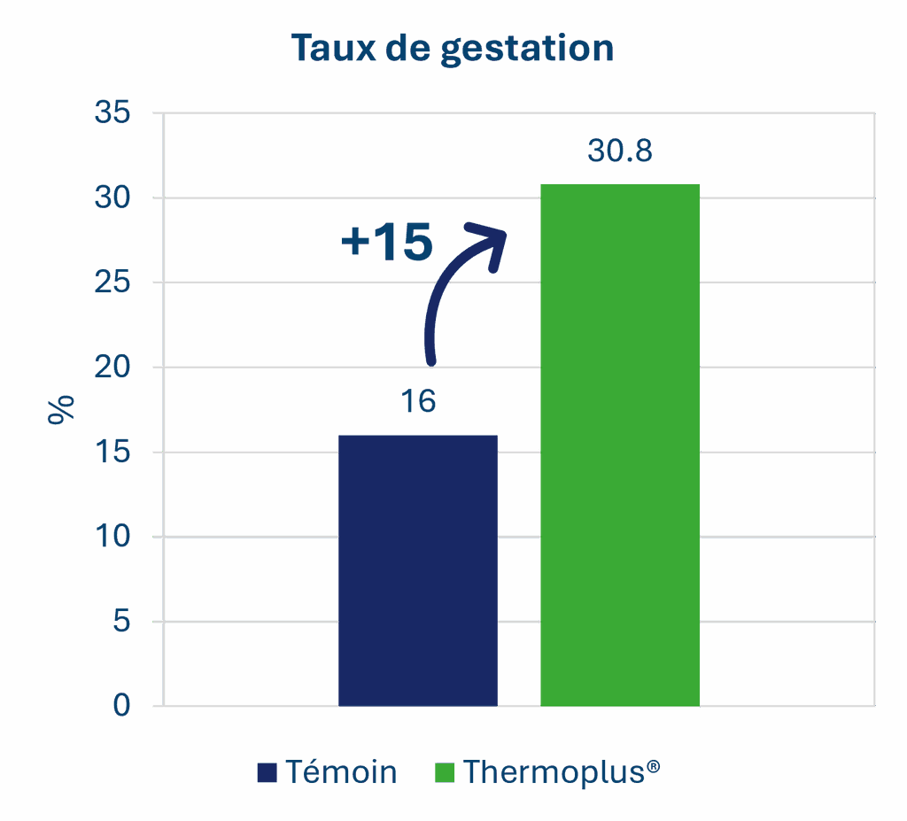 Thermoplus® soutient également l’ingestion et contribue à stabiliser l’équilibre énergétique, deux paramètres essentiels à la qualité de l’ovulation et à la survie embryonnaire. Thermoplus®, via son action sur la charge thermique, l’ingestion et l’équilibre hormonal, constitue un levier efficace pour sécuriser les performances en période estivale.