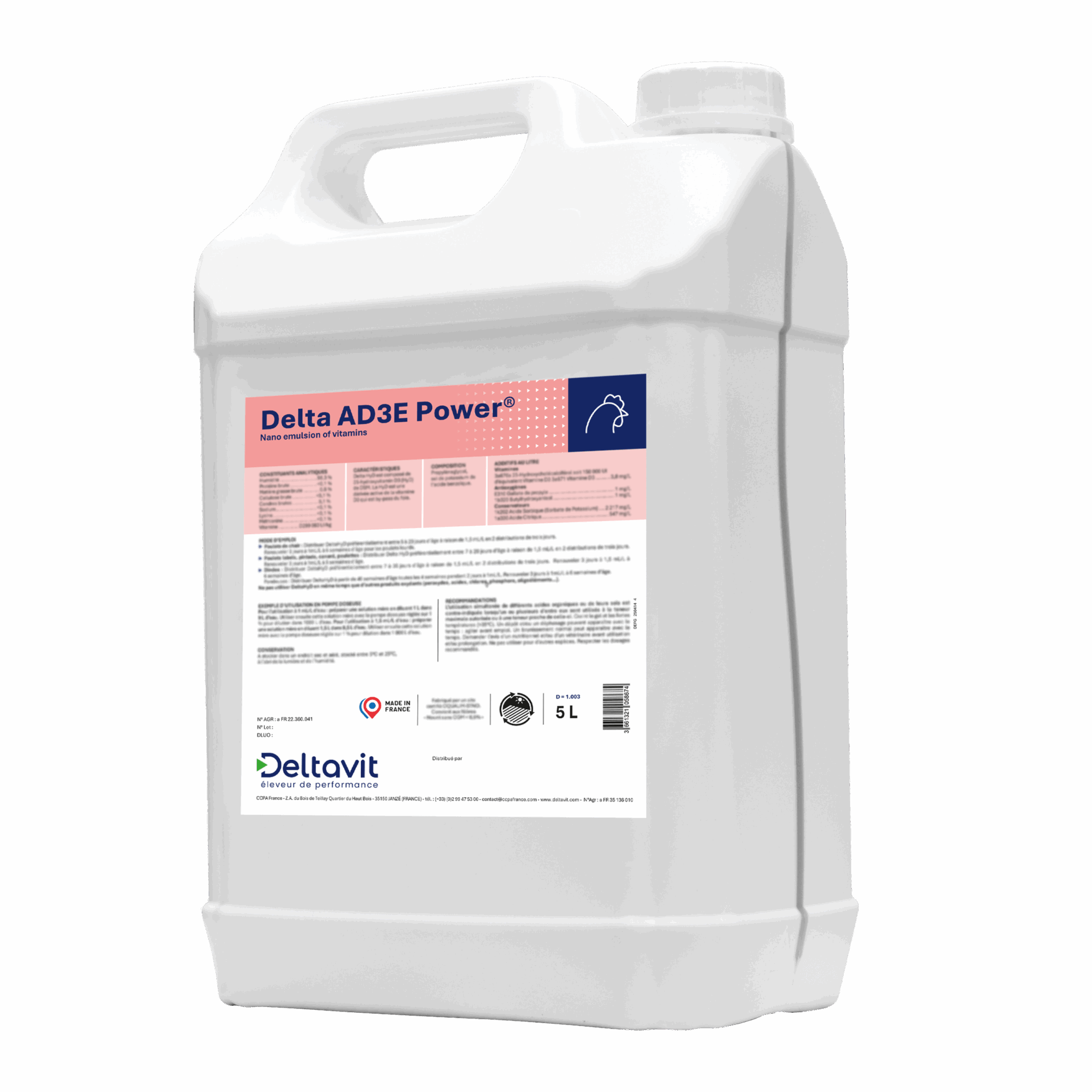Delta Vit AD3E est une nano-émulsion de vitamines liquides qui fournit à toutes les espèces animales une source hautement stable et biodisponible de vitamines A, D3 et E.